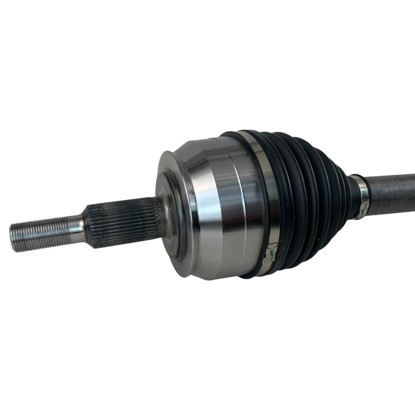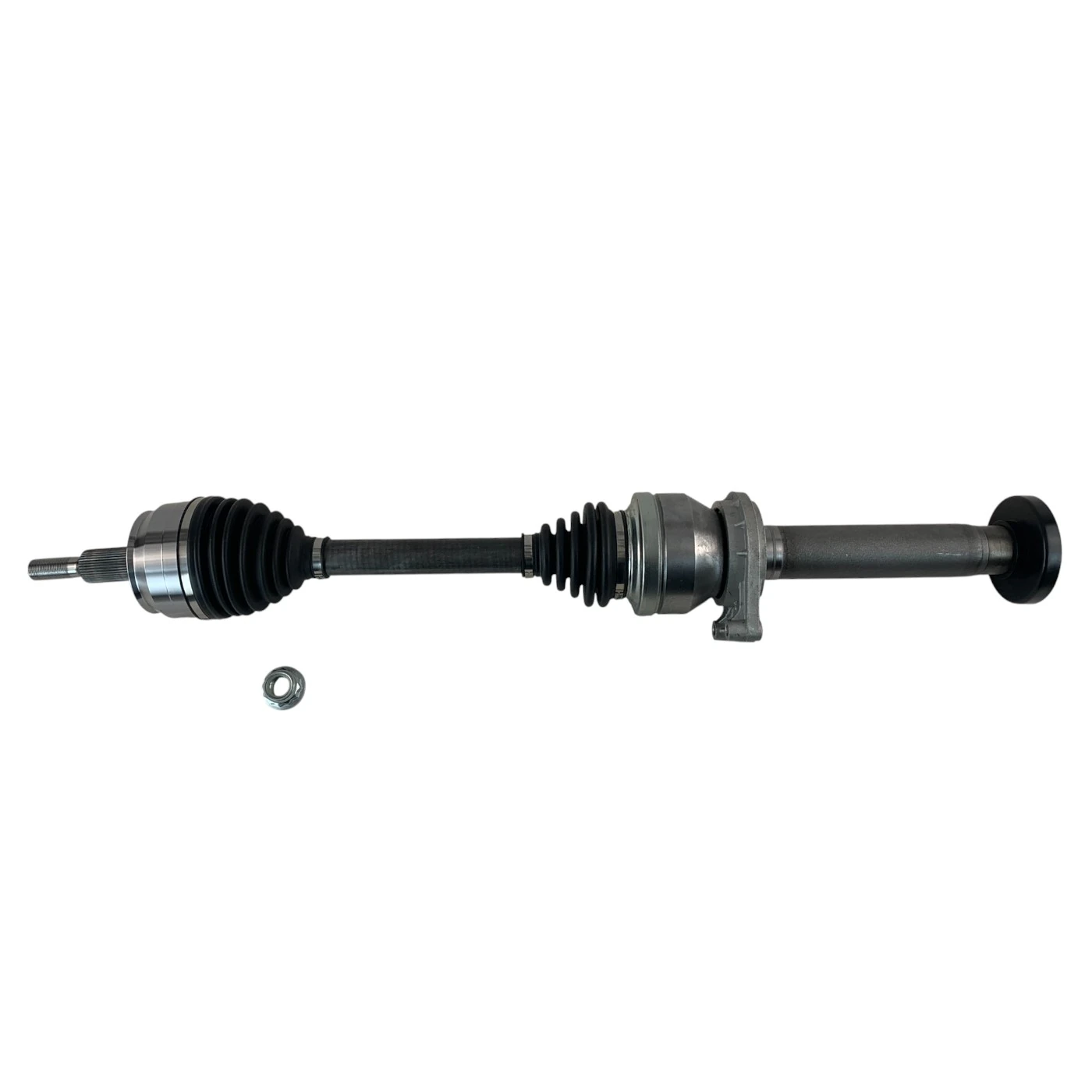 Robust drivaxel anpassad för Volkswagen Transporter T6 2.0 TDI, monterad på höger framsida. Produkten är utrustad med både inre och yttre drivknut för optimal kraftöverföring. Tekniskt utformad med 38 splines på hjulsidan och 28 på växelsidan.